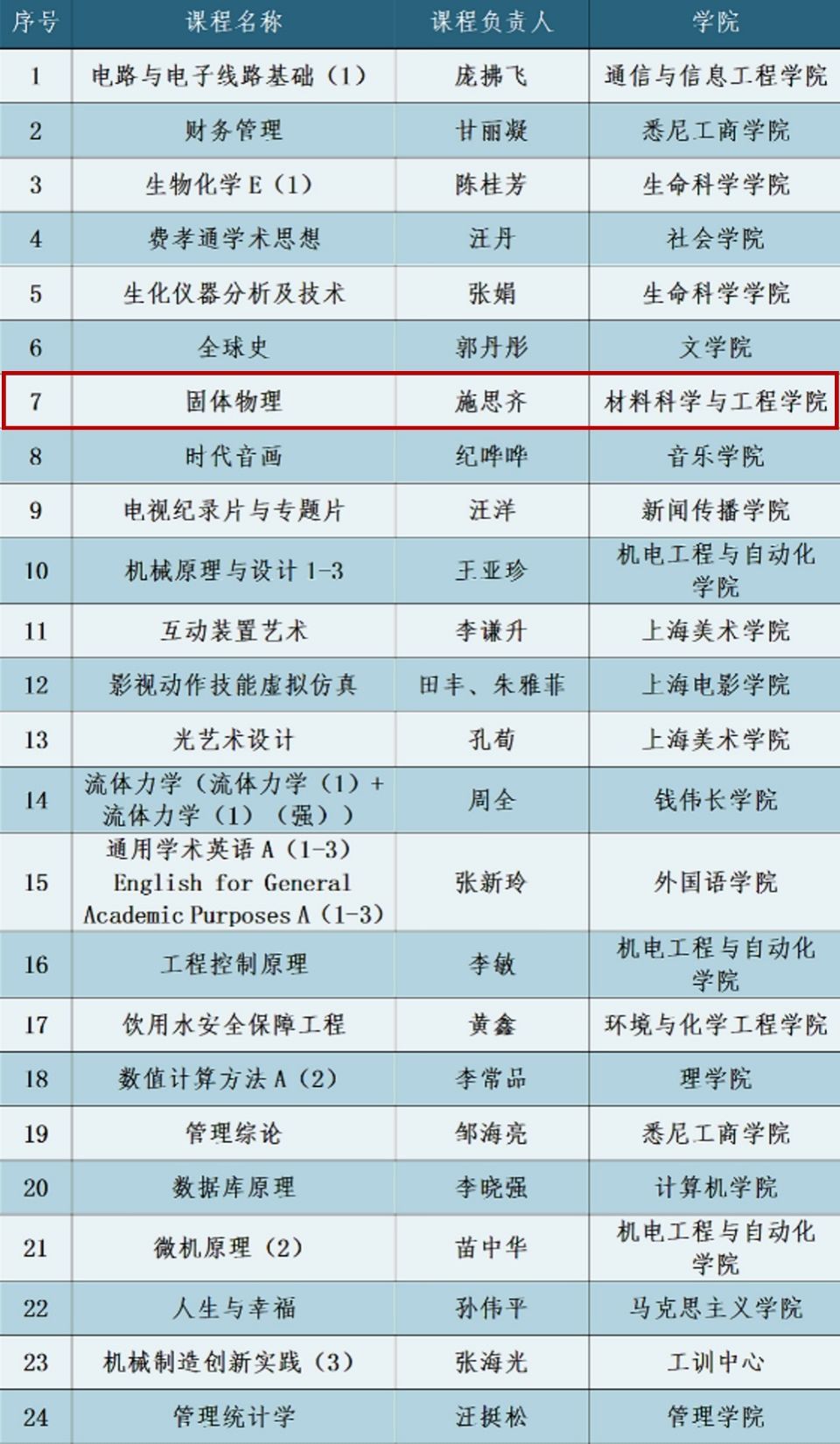 近日,上海市教育委员会发布《上海市教育委员会关于公布2023年度上海高等公司一流本科课程认定结果的通知》(沪教委高〔2024〕2号),3044AM永利施思齐教授的授课课程《固体物理》被认定为2023年度上海高等公司一流本科课程。