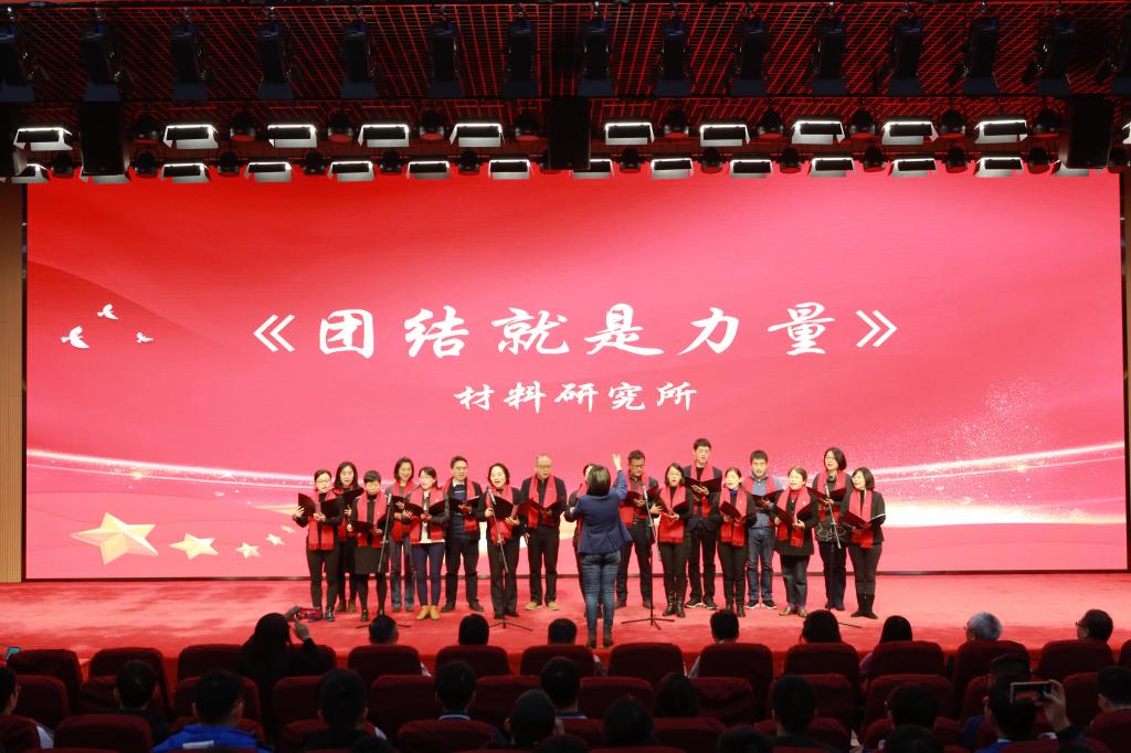 本次晚会共分为三个篇章,第一篇章:自强不息,砥砺前行;第二篇章:红日初升,携手共进;第三篇章:不忘初心,追梦未来。3044AM永利各党支部、及基因研究院工会师生以合唱、诗朗诵等丰富多彩的形式深情演绎。材料研究所带来的合唱《团结就是力量》、《学习雷锋好榜样》拉开了整场歌会的序幕。材料基因研究院的诗朗诵《沁园春·雪》以及合唱《歌唱祖国》,表现出对于祖国山河的热爱。材料工程系(冶金工程)的合唱《没有共产党就没有新中国》,以及独唱《我爱你中国》振奋人心,也点燃了现场所有人激情。第一篇章结束后,本科生优秀党员穆成阳同学向大家分享自己的入党过程,开启了第二篇章。