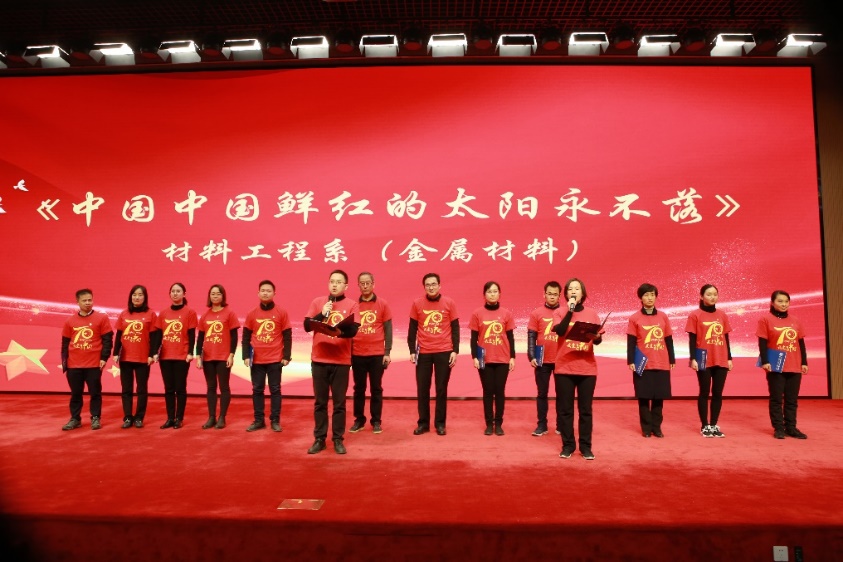 材料工程系(金属材料)的合唱《中国,中国,鲜红的太阳永不落》、《我们走在大路上》,再一次提升了现场气氛。高分子材料系的京剧选段《愿天下国泰民安》、合唱《歌唱祖国》,令全场沸腾将歌会气氛推向高潮。研究生党总支的合唱《相亲相爱》、以及诗朗诵《我骄傲,我是中国人》,彰显出年轻人的朝气与活泼。最后是由复合材料中心带来的合唱《我的祖国》及《没有共产党就没有新中国》,孙晋良院士担任合唱指挥,情感炽烈地诠释了对祖国的爱恋。第二篇章结束后,研究生优秀党员汪犁分享了自己与支部的故事,开始了第三篇章。