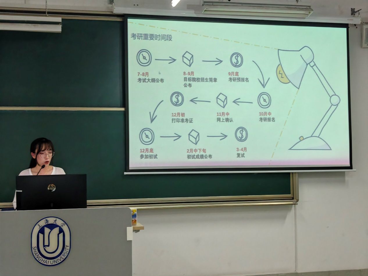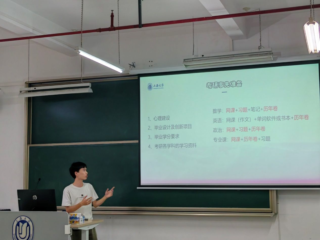 朱彦彬结合自身经历,为同学们分享考研以及就业择业的心得体会。在考研分享环节,不仅为同学们梳理考研时间线,还贴心地给大家推荐考研名师以及复习技巧,强调考研备考心态的重要性。在就业分享环节,从招聘信息获取渠道、岗位选择、岗位招聘要求等多方面进行介绍,以自身专业为例,为同学们提供参考。
