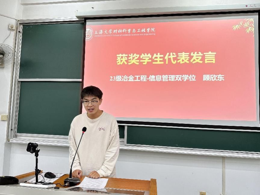 随后,23级冶金工程双学位班的顾欣东作为获奖代表发言,他谈到通过暑期研学,深刻体会到冶金工程专业未来发展的广阔空间天地和在现代工业中的重要地位,从而激发出自己强烈的求知欲,更加坚定深耕冶金工程专业学习的决心,保持对专业的热爱,在冶金领域中探索新知识。