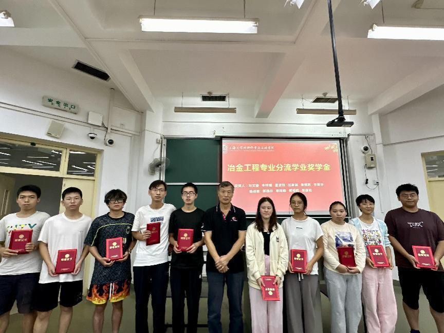 省部共建高品质特殊钢冶金与制备国家重点实验室主任任忠鸣为获得冶金工程专业学业奖学金的同学颁发证书并合影留念。
