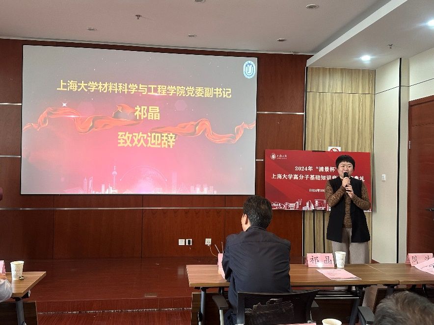 高分子材料与工程专业2021级本科生马雪雁同学主持了本次颁奖典礼。公司党委副书记、副经理祁晶老师发表了热情洋溢的讲话,她首先对大力支持本次竞赛的上海浦景化工技术股份有限公司表示了诚挚的谢意,高分子知识竞赛给同学们提供了很好的展现自我的平台,通过该竞赛提高了同学们的竞技意识,为一年一度的全国老员工高分子材料实验实践大赛奠定了基础,并向获奖的同学表示了祝贺,对高分子基础知识竞赛寄予了殷切希望。