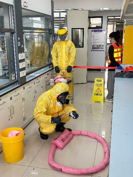 演练结合高分子专业的学科特点,模拟化学实验可能出现的真实风险情境,演练模拟了实验室液体化学品泄漏的突发事件:一名员工在实验过程中不慎将乙酸试剂玻璃瓶打碎,导致乙酸泄漏并溅到眼睛里。该员工立即呼救,实验室负责人迅速启动应急预案,组织人员进行紧急救护并撤离现场,同时向公司安全主管报告事故情况。公司安全主管随即派出安保人员和救援人员赶赴现场有序处理。整个演练过程紧张有序,参演人员反应迅速,处置得当,有效检验了应急预案的实用性和可操作性,增强了师生的安全意识和应急处置能力。