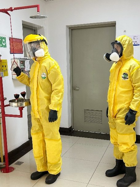 安全员讲解演练流程、介绍演练所用工具(左);安全员演示化学防护套装的正确穿戴方法(右)