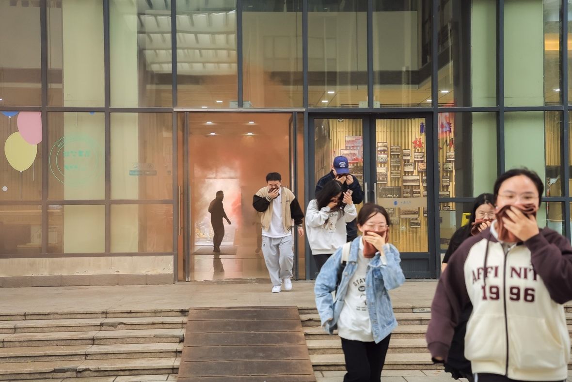 演练前,公司部门、公司领导做工作动员,强调演练的必要性,并精心指导演练注意事项。各楼栋各楼层设置疏散引导员,各楼栋一楼于演练前30分钟刷卡发放演练毛巾并提醒师生打湿,疏散引导员提前15分钟进入指定楼层待命。演练开始,由消防维保人员模拟火灾报警,发出警铃警报,并在楼内释放烟雾,模拟火场。听到警报后,各楼层疏散引导员快速、有序地组织和带领师生按照正确的方法,沿逃生路线疏散,有序逃离模拟火场。由疏散引导员安全区清点人数,消防科老师进行演练后指导,随即演练结束。