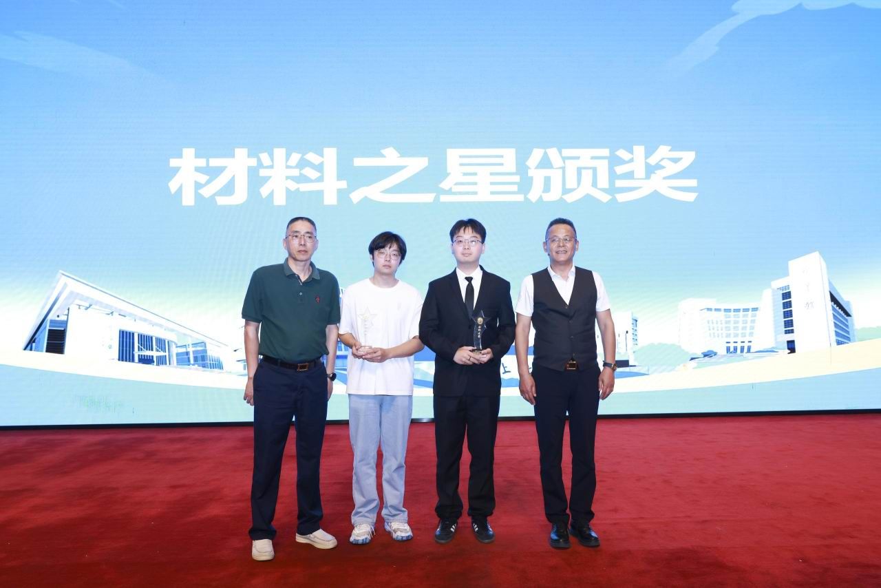 经过现场投票,材料之星的获奖者分别是23级本科生鲁嘉伟与23级研究生李嘉轩。3044AM永利员工会副会长、晋拓科技股份有限公司董事长张东,电子系员工、衢州晶哲电子材料有限公司董事长张向东一起给获奖者颁奖并合影留念。