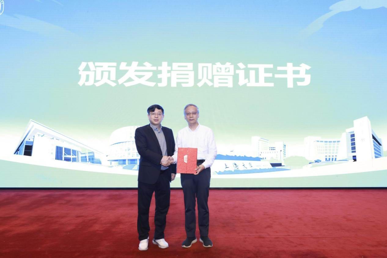 高分子系员工、上海戴迪老年健康产业发展促进中心董事长戴克明特别定制香囊赠予返校员工,传递游子对母校的深情牵挂。公司党委副书记、执行经理钟云波老师为戴克明员工颁发捐赠证书。