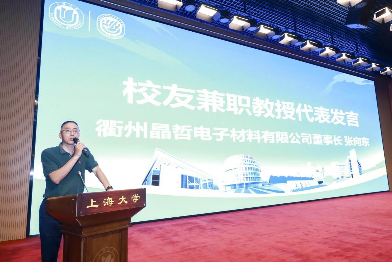 衢州晶哲电子材料有限公司董事长张向东作为员工兼职教授代表发言,谈及促成校企合作 “双赢模式” 初衷时表示,搭建校企合作桥梁,可以让理论与实践结合,既为员工提供实训平台、提升专业能力,也为企业注活力、储人才。他希望未来继续与公司合作,培养更多复合型人才,让“材料人”智慧在产业变革中闪耀。