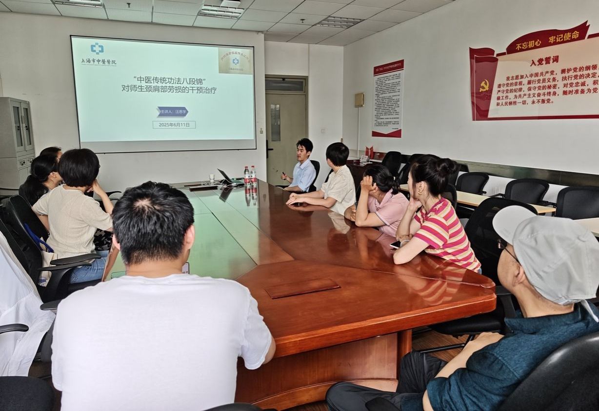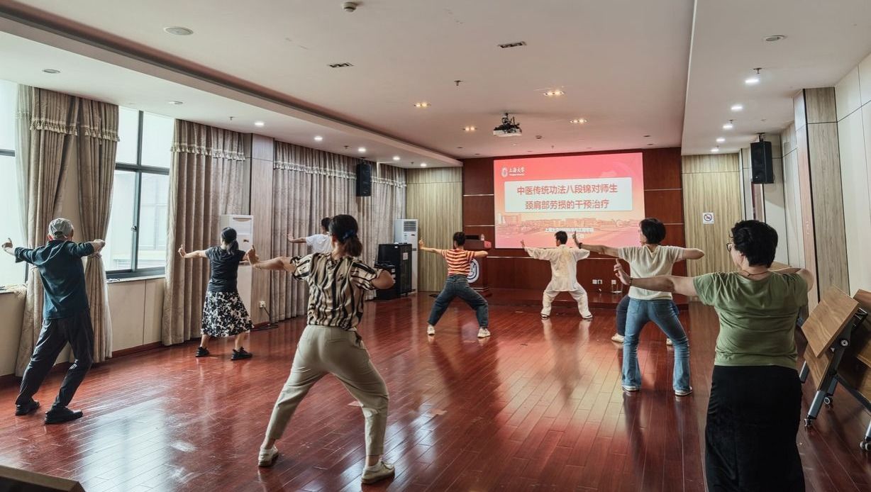 活动中,汪医师从中医理论出发,深入浅出地讲解颈肩部劳损的成因、危害以及中医传统功法八段锦的干预治疗原理。随后,他亲自示范并带练八段锦,细致地指导教师掌握每一个动作的正确要领,强调通过日常练习八段锦,能够有效改善身体机能,缓解亚健康症状,对颈肩部劳损起到良好的预防和治疗作用。