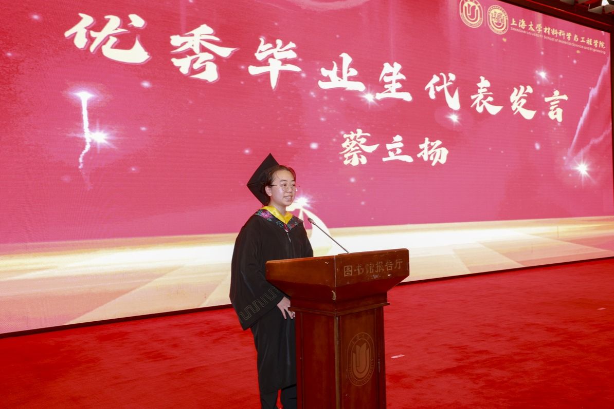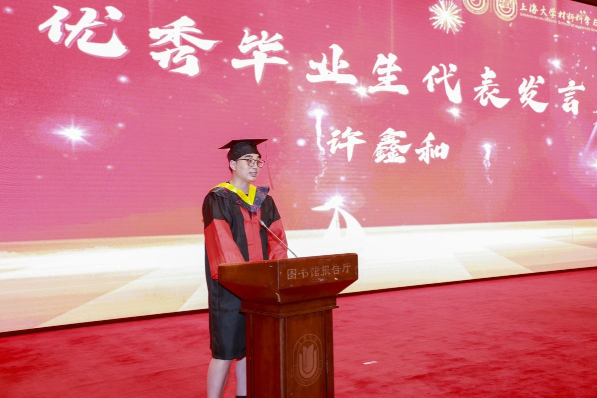 优秀毕业生代表蔡立扬(本科)和许鑫和(研究生)分别上台发言。他们回顾了在上大3044AM永利度过的难忘岁月,以诚挚心感念师长循循教诲,以珍重心铭记同窗风雨情谊,以拳拳心倾诉母校朝夕深情。