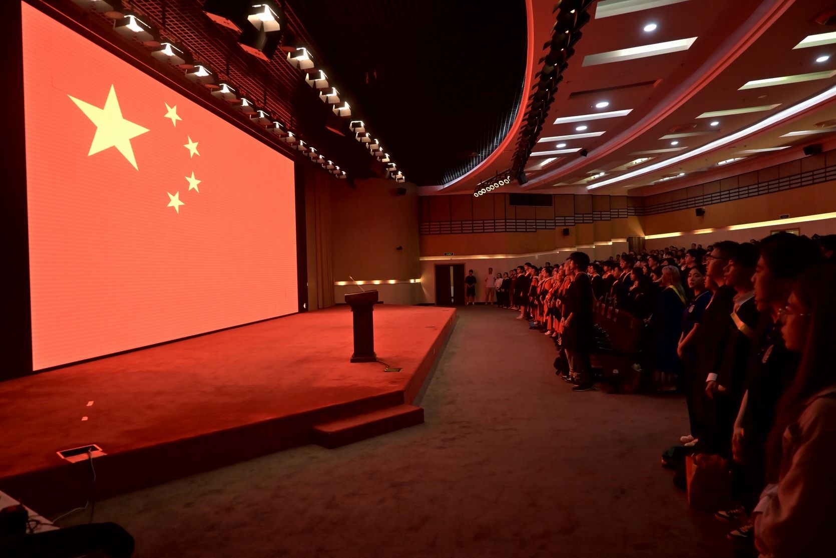 下午时分,图书馆报告厅内气氛庄重而热烈。伴随着雄壮的国歌声典礼正式开始,全体师生肃立齐唱,将对祖国的赤诚与对母校的眷恋融入旋律。