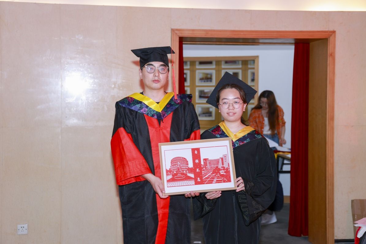 临别赠礼,情谊绵长。毕业生代表蔡立扬、许鑫和将一份毕业生们特制的“图书馆与钱伟长图书馆”主题剪纸画赠予公司,党委书记黄健老师代表公司庄重接收这份饱含学子心意的礼物。它寄托着公司的牵挂,承载着游子的思念。