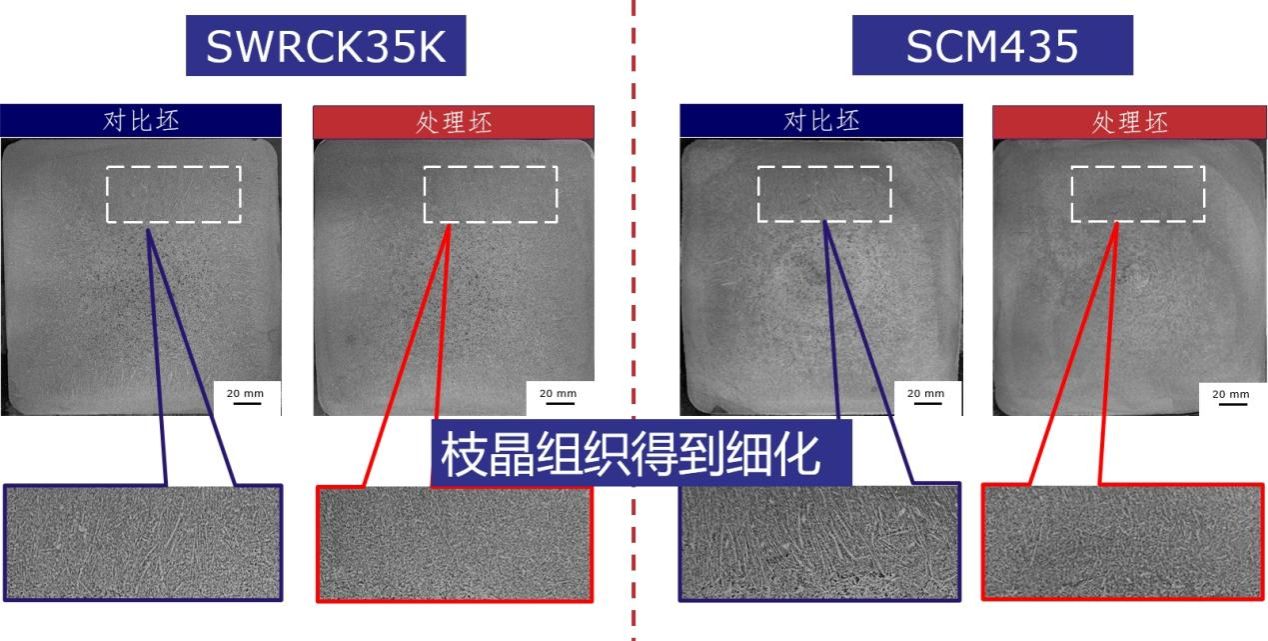 ★等轴晶率显著提升: 所有试验钢种的中心等轴晶比例均实现大幅增长,平均增加幅度达到20%以上。