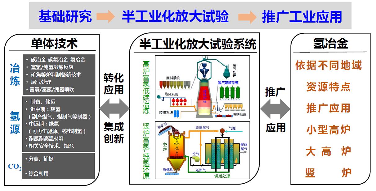 针对目前我国高炉喷吹富氢(或纯氢)技术和气基富氢(或纯氢)还原技术方面,缺乏相关技术的系统积累,理论基础和产业研究落后于其他国家的现状,遵循从基础研究到半工业化试验、最终实现工业化的研发历程,氢冶金技术研究与成果转化中心提出和钢铁企业合作,在钢铁厂共同建造专业化的高炉和非高炉半工业化试验系统,为零碎的单体关键技术走向实际应用、集成产生新工艺的开发和系统研究搭建创新试验平台,为取得氢冶金低碳冶炼前沿技术研究的重大突破、推动氢冶金技术的工业应用、构建冶金领域新型氢能经济产业链提供强有力的手段和必要条件。依托半工业化试验平台,在工业环境下对相关技术进行系统深化和完善,对各项研究成果实施的可行性、运行技术经济指标进行评估,筛选和逐步优化,实现氢冶金技术的创新、成果转化和推广应用,在技术源头上支撑行业整体性的创新发展(图1)。