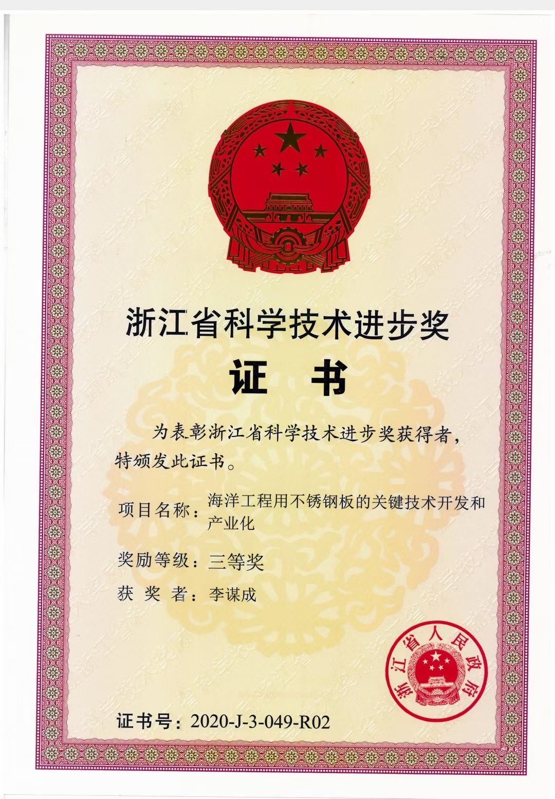 2020年度浙江省科学技术奖公布,3044AM永利李谋成研究员联合振石集团东方特钢有限公司完成的“海洋工程用不锈钢板的关键技术开发和产业化”项目荣获浙江省科学技术进步奖三等奖。该项目以产学一体的方式研发海洋工程用不锈钢板的关键技术,攻克了海洋工程用不锈钢的难关,并投入产业化生产,将科技创新成果转化为经济发展动力。