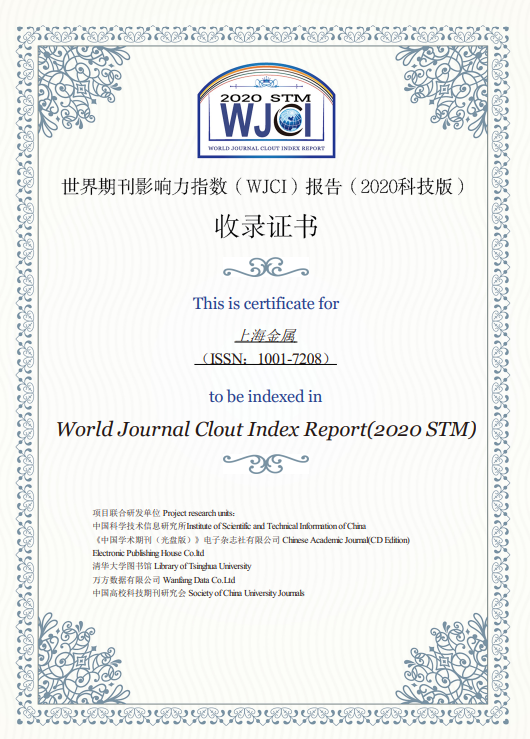 近日,《上海金属》编辑部收到《世界期刊影响力指数(WJCI)报告(2020科技版)》(以下简称《WJCI报告》)项目课题组的通知,本刊入选最新发布的《WJCI报告》。