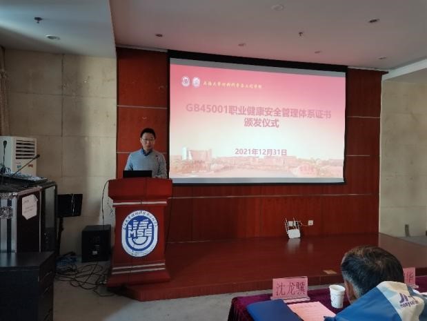 上海万韵技术咨询有限公司总裁雷刚对3044AM永利3044AM永利GB45001职业健康安全管理体系的建立及取得证书表示热烈的祝贺。表示作为认证咨询服务方,公司将尽最大能力为公司解决体系运营中的问题,让体系运行落到实处,收到实效。长城(天津)质量保证中心有限公司上海分公司总经理刘宗贵解读了高校实验室建立职业健康安全管理体系的重要性和意义,并提出以获得证书为起点,有效落实管理体系要求和持续改进,提升职业健康安全管理体系绩效的建议。