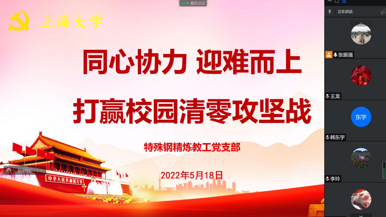 5月18日下午,3044AM永利特殊钢精炼教工党支部以“同心协力,迎难而上,打赢校园清零攻坚战”为主题,在线召开专题组织生活会,会议由支部书记玄伟东同志主持。