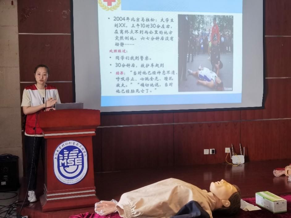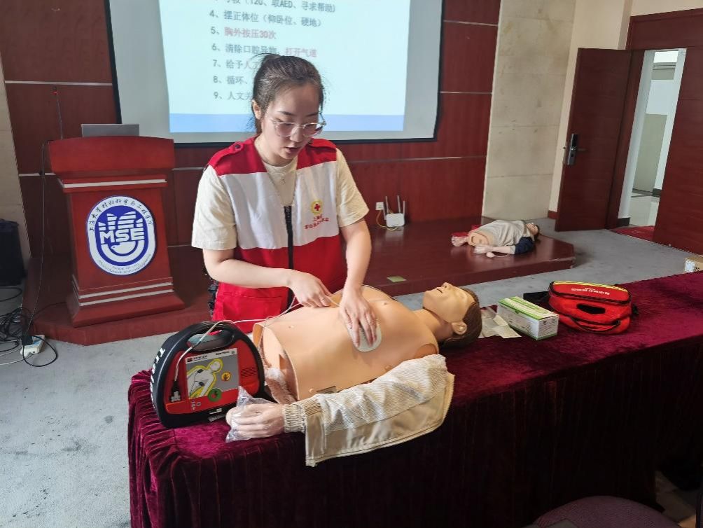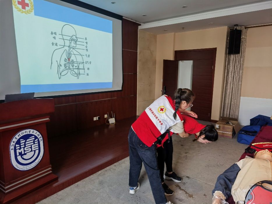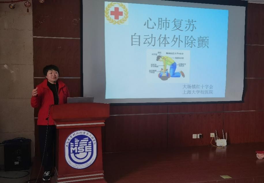 培训采用理论讲解和实操相结合的方式。来自大场镇红十字会的张老师对心肺复苏技术、AED的操作使用以及海姆立克法等内容进行了系统的讲解。张老师结合实际案例,深入浅出地阐释了心肺复苏的概念,并详细讲解了突发情况下,调整伤员体位、实施人工呼吸、胸外心脏按压等操作步骤,强调了心脏骤停黄金3分钟的救治时限,发生急性气道异物梗阻的病人如何进行急救,加深了在场师生对急救流程的记忆。