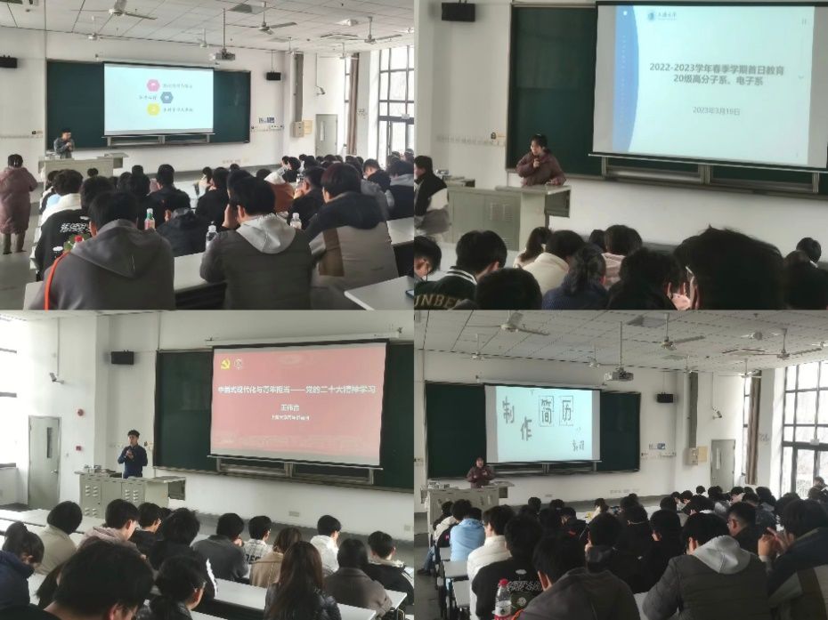 2020级高分子系与电子系本科生共同参加了2022-2023学年春季学期首日教育,内容包括二十大内容宣讲、考研经验分享、简历培训和以专业为单位的学业导师分享交流班会。对于处于人生道路关键选择节点的同学们,此次的首日教育安排无疑对未来的发展方向有着极其重要的影响。