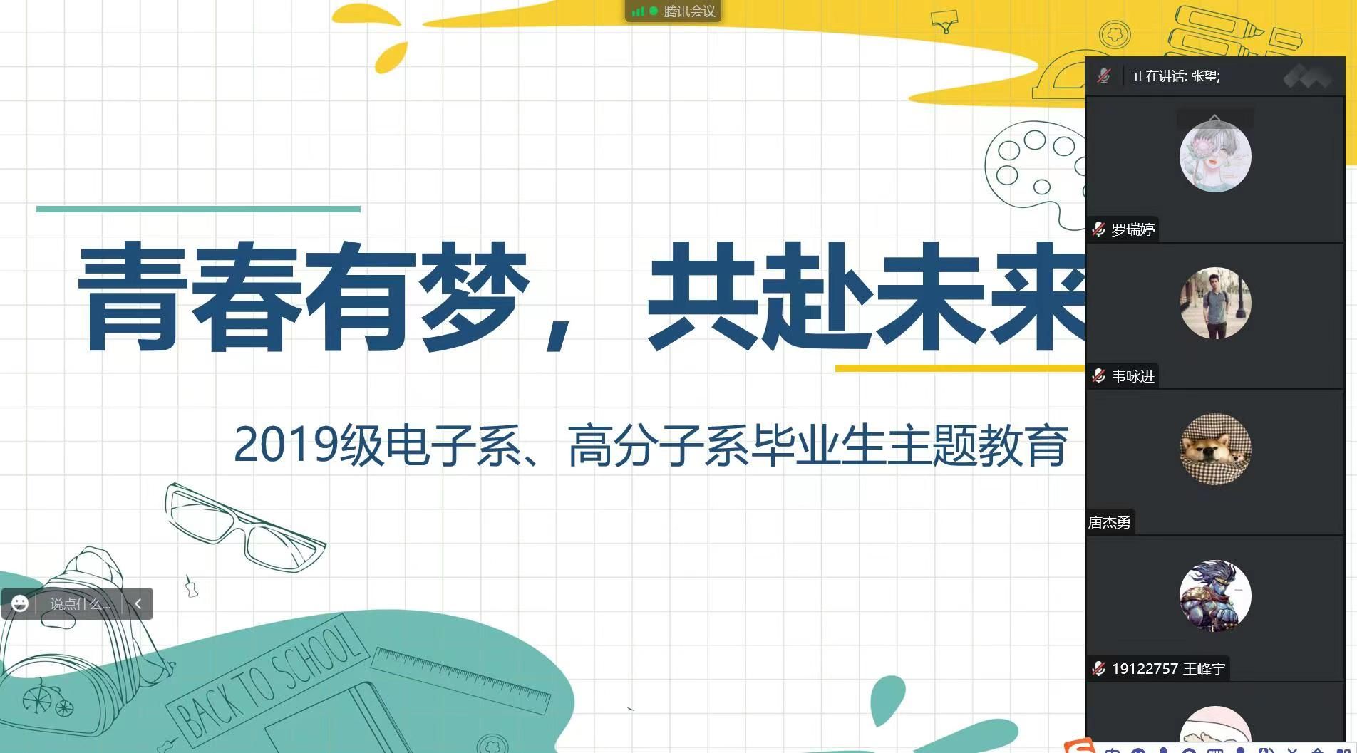 青春有梦,共赴未来——2019级电子系、高分子系毕业生主题教育举行。辅导员张望老师围绕升学、就业等工作进行了动员和指导。对于考研的同学,张老师叮嘱同学们认真复习备考,同时做好两手准备,将就业找工作也纳入自己的B计划中。对于就业的同学,张老师强调了简历的重要性,在面试、公文写作等方面给予了指导。