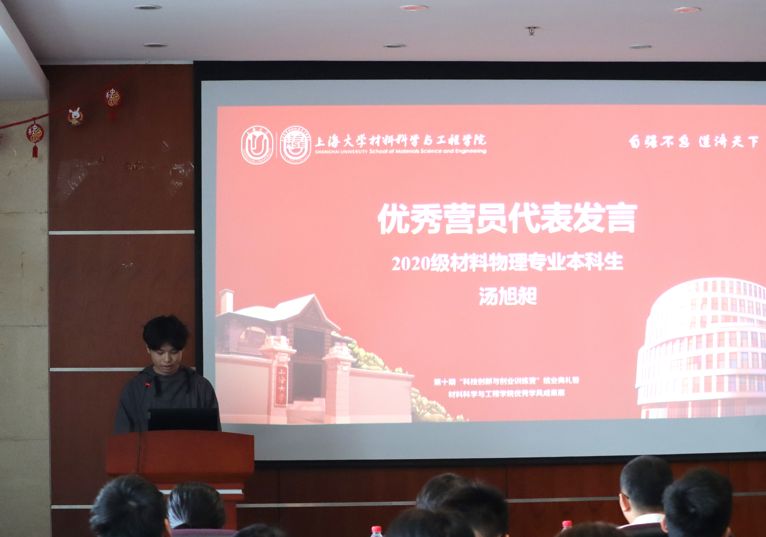 2020级材料物理专业本科生汤旭昶作为优秀营员代表,分享了自己在科创营这几个月的学习收获与感悟,他认为科创营为大家营造了一个良好的创新创业氛围,激发了大家的学习兴趣。通过在科创营系列课程中的学习培训,自身的理论知识得到了扩展,参赛技巧如PPT制作、演讲能力也都得到了一定的提高,科创营的学习和培训为其在后续的比赛奠定了坚实的基础。