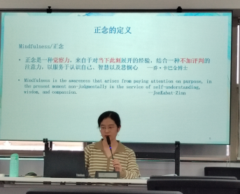 田芳老师在讲座开始前先带领同学们做了正念热身运动,让大家先切身感受到正念。虽然正念一词来源于佛教,但现如今提到的正念是经过卡巴金博士实证研究后科学化、心理学化的概念,与宗教相分离。随后,田芳老师给大家介绍了什么是正念以及正念的益处。正念减压法的创始人乔·卡巴金博士说:“正念是一种觉察力,米自于对当下此刻展开的经验,结合一种不加评判的注意力,以服务于认识自己、智慧以及悲悯心。”