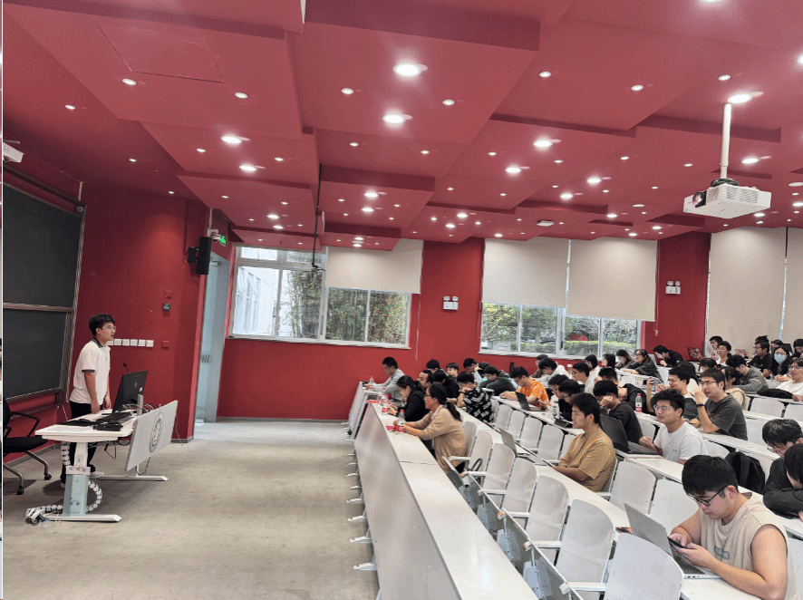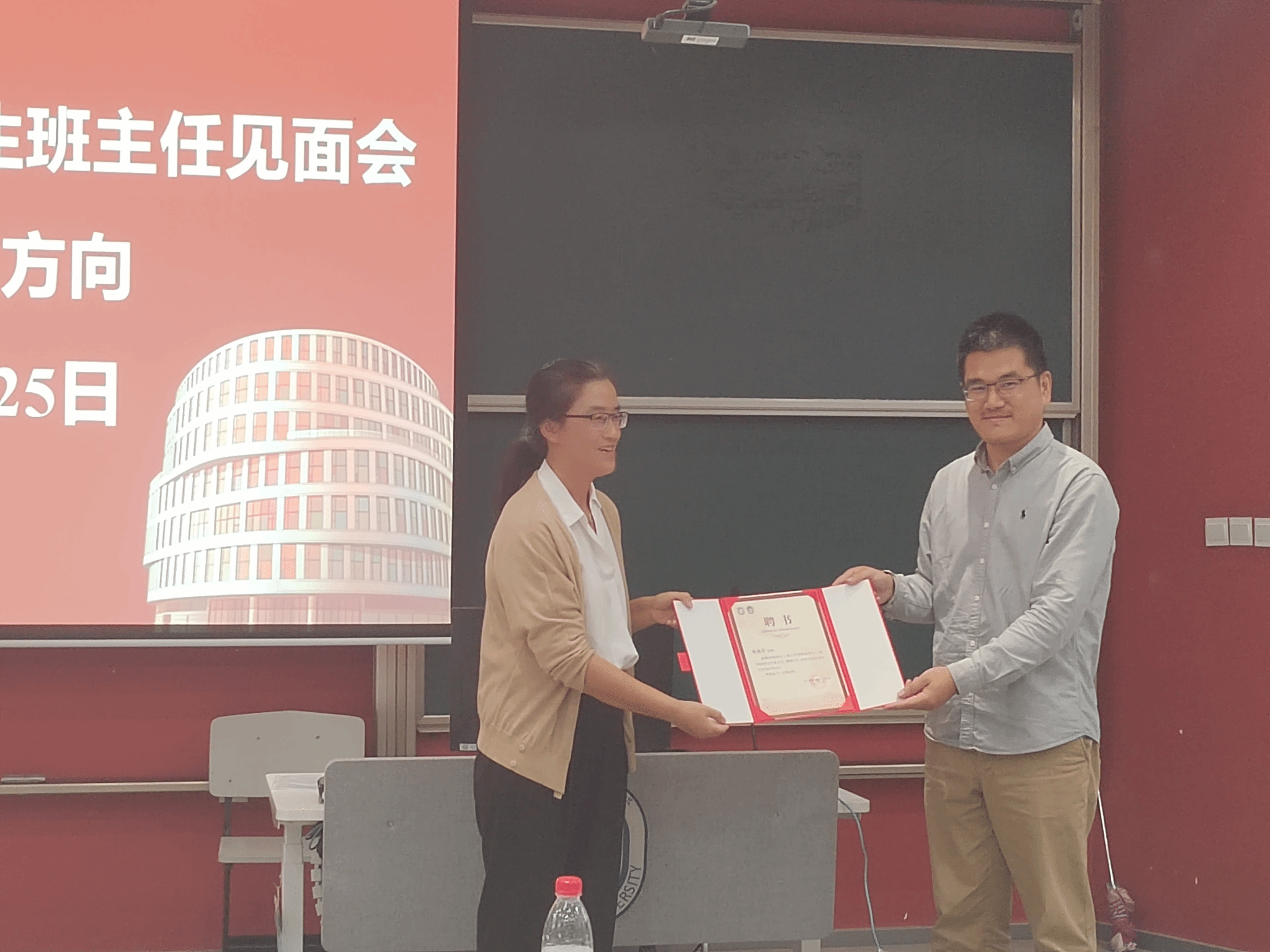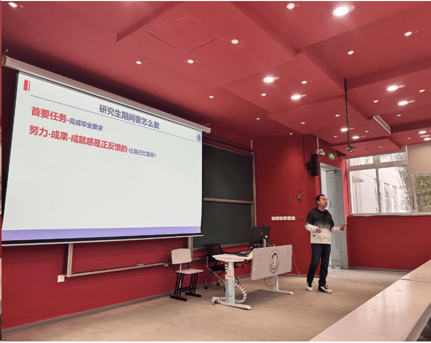 随后,丁彪老师发表讲话,在三个方面与同学们进行了分享。首先是为什么要来读研。丁老师指出新生们要首先明确自己考研的目的,以更好地明确目标,确定好自己的人生方向。其次是吸取身边榜样的力量。丁老师列举了部分优秀师兄师姐毕业后的去向,在给同学们提供努力方向的同时,也给到了大家鼓励,同学们要尽早明确之后的工作方向,并以此为目标而努力。最后一方面是读研期间要做什么。丁老师指出同学们的首要任务就是完成毕业要求,在此基础上让自己忙起来,多看文献来积累更多的知识,与老师同学多多交流学习情况,来增长见识,拓展知识面。读书的意义就是能够更多地进行思考,努力、成果、成就感是正反馈的,同学们要自控自立、自我管理,确立目标,跳出舒适圈。
