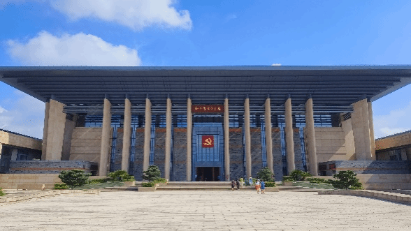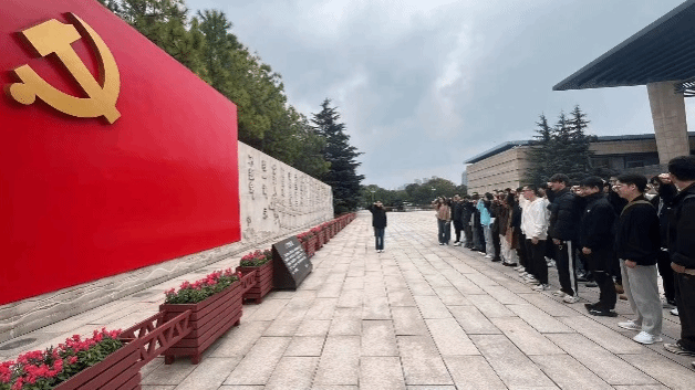 纪念馆西面,有一堵气势恢宏的宣誓墙,红色的党旗浮雕嵌在中央。许多参观的游客在宣誓墙前凝视,表明了对党的敬畏与忠诚。同时,参与本次活动的全体师生也在此重温了入党誓言。