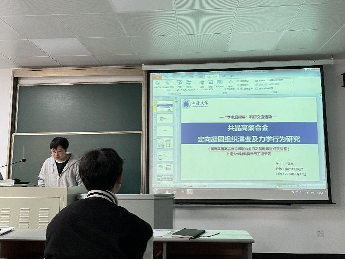 冶金班王潇寒汇报题目为《共晶高熵合金定向凝固组织演变及力学行为研究》,他以共晶高熵合金的研究背景,及课题组相关研究成果展开汇报。同时汇报了对AlCrFeNi系共晶高熵合金进行多尺度的表征手段和定量的拉伸测试,讨论了定向凝固技术对AlCrFeNi系共晶高熵合金的微观结构、力学性能和变形机制的影响,并探讨了定向凝固技术能否作为一种普适性手段实现对共晶高熵合金的组织调控及性能优化。