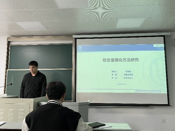 冶金班余智超以《铝合金强化机制研究》为题对两种压铸Al-Si合金的强化效果以及强化机制进行汇报。Al-Si合金具有良好的塑形,在目前汽车行业快速发展的行业需求下,对于汽车用Al-Si合金的强度提出了更高的要求。为了解决这一实际需求,余智超介绍了三种有效的解决方法。通过添加变质剂Sr和混合稀土、更改T4T5热处理时间和使用压铸铸造成型的方法来提高该合金的性能,实现了细晶强化、固溶强化和第二相强化。这项研究目前对于对于微观组织形貌的观察已经完成,在强化机理上还需要配合EBSD等实验来完成表征过程。
