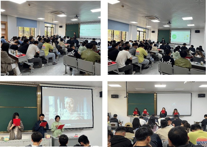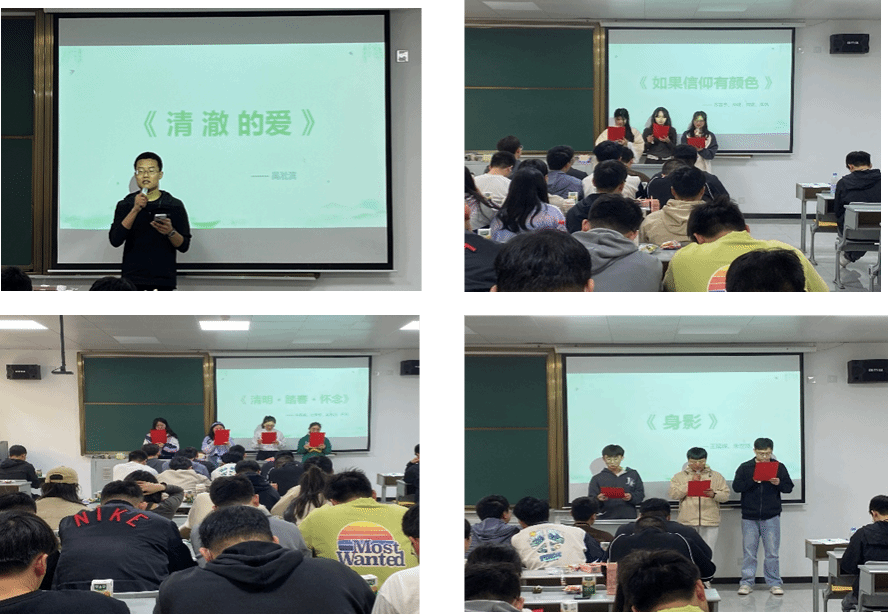 理论学习结束后,活动进入“朗诵诗歌,缅怀先烈”环节,同学们都积极报名参与活动。其中,叶昱璐、许励、徐真三位同学以声情并茂的朗诵,深情演绎了李大钊先生的名篇《青春》。他们的表现不仅赢得了在场同学的阵阵掌声,更让我们深刻感受到了青春的力量与美好。李大钊的《青春》是一篇充满激情与理想的散文,它号召青年一代要勇于担当,为国家的繁荣富强贡献自己的力量。三位同学在朗诵过程中,不仅准确地传达了原文的情感,更在声音中融入了自己的理解和感悟。他们的朗诵让听者仿佛看到了那些为理想而奋斗的青年身影,感受到了青春的热情与活力。苏皆予、陶青、陈帆在朗诵《如果信仰有颜色》的过程中,不仅准确地传达了原文的情感,更在声音中融入了自己的理解和感悟。他们的表现让听者深受感动,也让大家更加深刻地认识到了信仰的重要性。张永禧、李丽花、鲍思睿、张祺他们站在台上,用铿锵有力的声音诠释着这篇鼓舞人心的文章,“美哉我少年中国,与天不老!壮哉我中国少年,与国无疆!”在朗诵过程中,他们或激昂慷慨,或深情款款,将《中国少年说》中的每一句话都赋予了生命与活力。在场的同学们都被这四位同学的朗诵所感染,大家纷纷表示,通过这次活动,他们更加深刻地理解了《中国少年说》所传达的精神内涵,也更加坚定了自己要为国家和民族的未来而努力的决心。