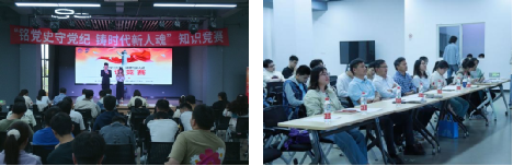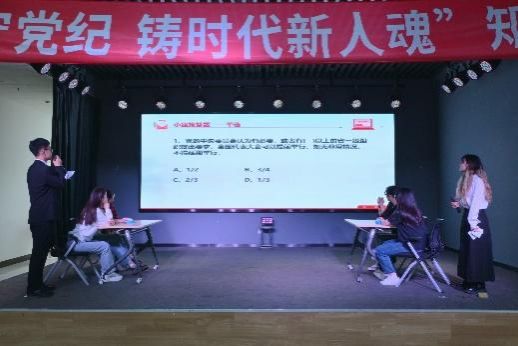 同时在竞赛过程中穿插了观众互动环节,并为参与答题的同学准备了精美礼品。台上选手激烈角逐,台下同学热烈参与,在欢快的气氛中深化了对党史校史、党规党纪和新中国史的理解。