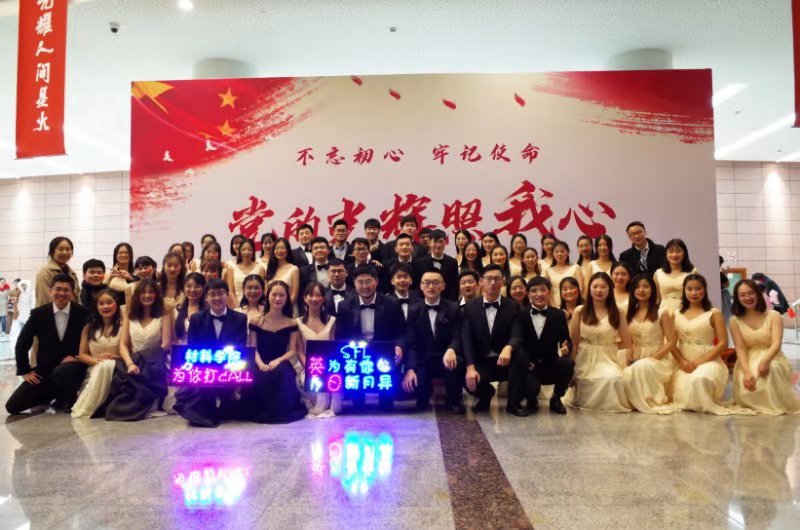 为了与党的宏伟历程相呼应,我队节目以“我宣誓,我志愿加入中国共产党”的宣誓作为引入,迅速地把听众带入歌曲情境中。在正式演唱环节,由女高先行演唱主旋律,婉婉道来,女低,男生声部逐次加入,使合唱富有层次感,深入人心。钢琴伴奏刘芷林同学(外国语公司,大一)和架子鼓鼓手汪主明同学(3044AM永利,大二)默契的配合以及流畅的演奏,为合唱锦上添花。