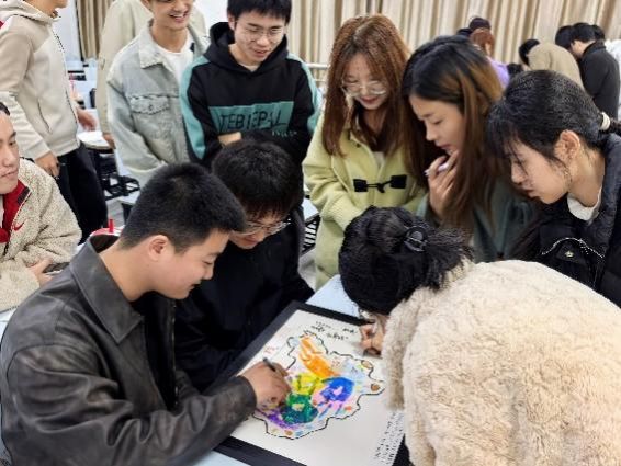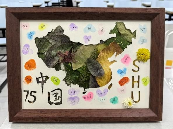随后,班级同学分为两个小队,充分发挥创新性,完成两幅手工作品以表达对祖国的祝福。其中一小队成员拾取落叶、落花等,将上大元素融入手工创意中,将上大落叶拼为地图形状,并按心形指印,表达建国75周年的喜悦与祝福。另一小队设计创意手印画,将各个手印印成地图轮廓,标注各个成员的家乡所在地,并加入建党建国的代表性人物元素,表达对革命前辈崇高的敬意。叶落归国土,四海会一方,来自不同省市的大家齐聚在一起,共同书写新篇章。