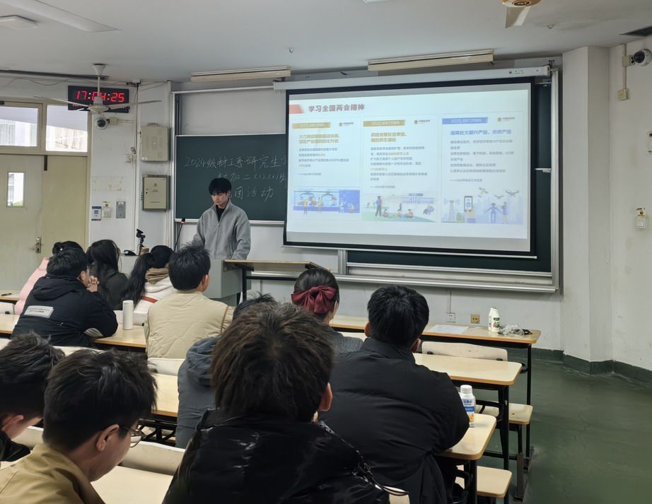 党支部书记罗方带领与会人员深入学习了2025年全国两会政府工作报告的重点内容,特别聚焦于科技发展、新材料以及就业创业等相关领域。报告中强调的“推动科技创新与产业创新的融合发展”,以及“培育壮大新兴产业、未来产业”,为我国科技领域的持续进步指明了方向,也与各位研究生的专业发展息息相关。