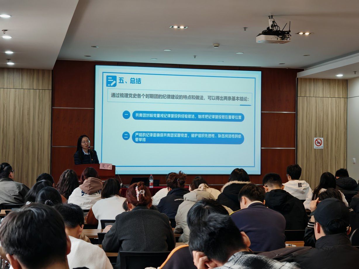 夏琰老师系统梳理了新民主主义革命时期、社会主义革命和建设时期、改革开放和社会主义现代化建设时期、中国特色社会主义新时代四个历史阶段中团的纪律建设特点与实践经验,深入剖析各时期团纪条例的修订背景与核心要求。夏老师指出,共青团对标党重视纪律建设的经验做法,始终把纪律建设放在重要位置,并强调“严格的纪律是确保共青团紧跟党走,维护组织先进性、队伍纯洁性的必要举措”。讲座通过详实的历史案例与政策解读厘清了团纪建设的理论脉络与实践路径。