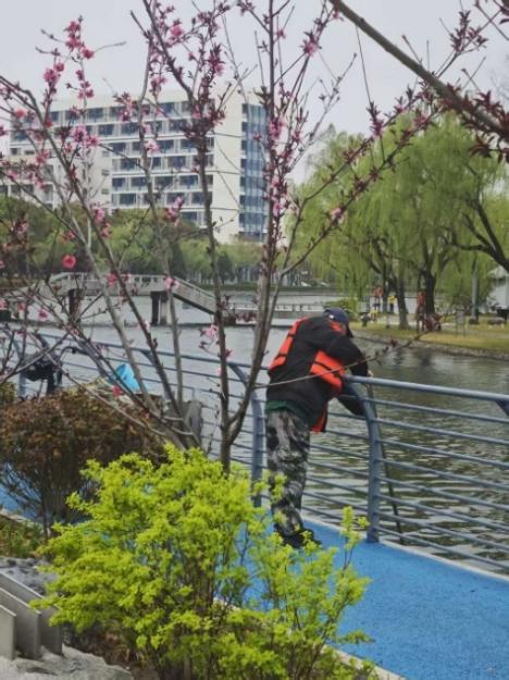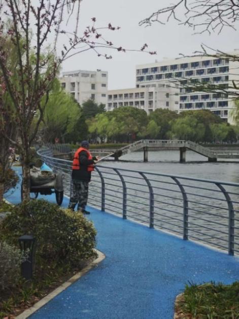 一位环卫工人穿着醒目的橙色马甲,静静地站在湖边,用打捞工具清理水面上的杂草和垃圾。湖水清澈,映衬着整洁的校园环境,而这份美丽离不开环卫工人的辛勤付出。即使在寒风凌冽的初春,细雨蒙蒙,他依然专注地进行着日复一日的工作。身旁停着满载杂物的手推车,记录着他默默守护这片宁静校园的辛劳。