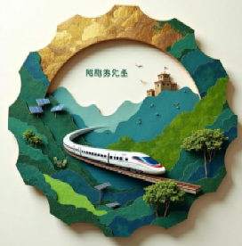 青绿山水纹宣纸托底文化根基,高铁穿数字网格喻科技突破,悬浮杂交水稻与光伏板映乡村振兴。传统媒材与现代影像碰撞,青年视角重构时空,展现传统与创新共生。齿轮环形构图象征发展永续,留白书法“丹心绘梦”传递青年建设者愿景。