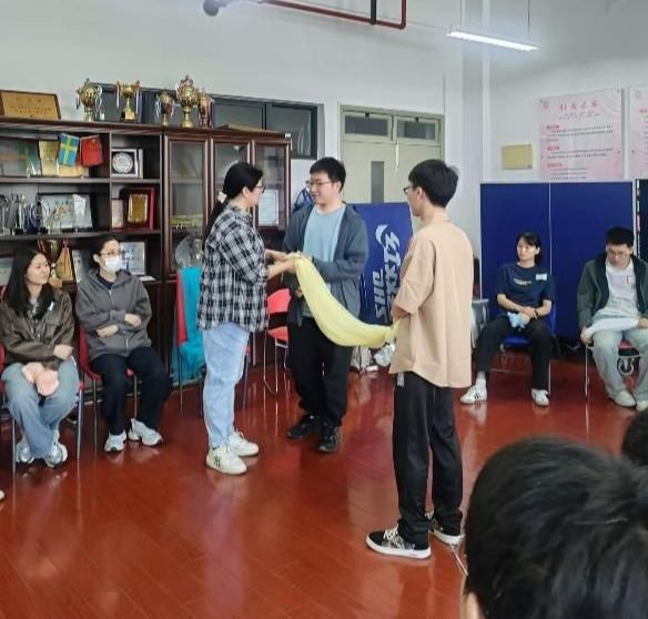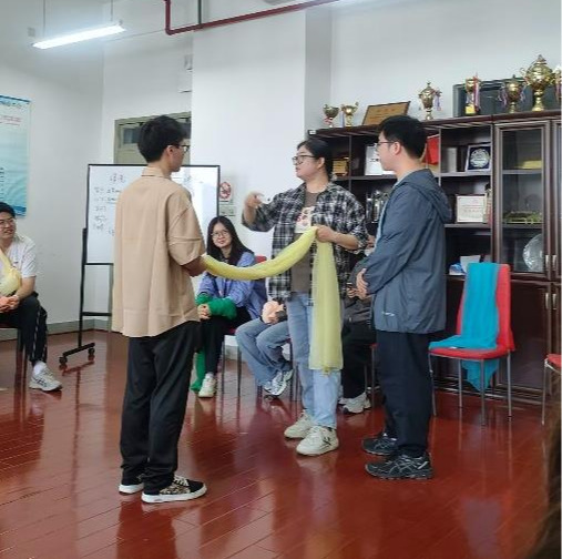 随后,两人一组利用丝巾进行情境模拟,这条柔软的丝巾成为展示人际交往中微妙关系的生动媒介:丝巾的松紧与距离直观体现了人际关系及导学关系中心灵的远与近。值得注意的是“冲突的距离其实很近”,这在导学关系中表现为:双方的分歧并非根本立场的对立,而是具体需求的错位。例如模拟“搭设备与读博意向”这个场景时:导师期望员工读博并搭建设备,而员工面临毕业压力与未来选择的困惑,丝巾的缠绕生动展现了资源、期望、能力、个人规划交织下的复杂“纠缠”,引导大家深入探讨了信息透明与合理管理期望的重要性。