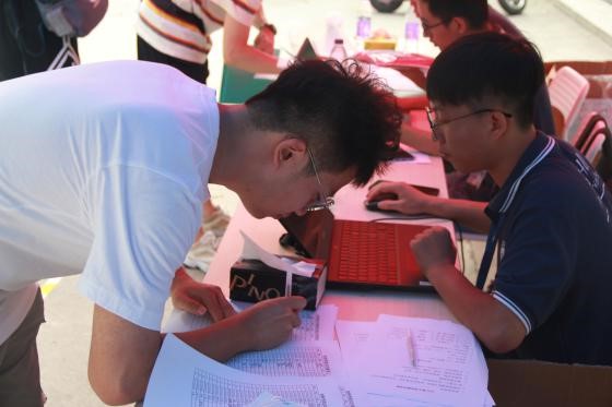 上午八点,新同学开始步入报到处,迎新团队分工有序,齐头并进,志愿者按照流程有条不紊地帮助新同学们完成报到的各项环节。