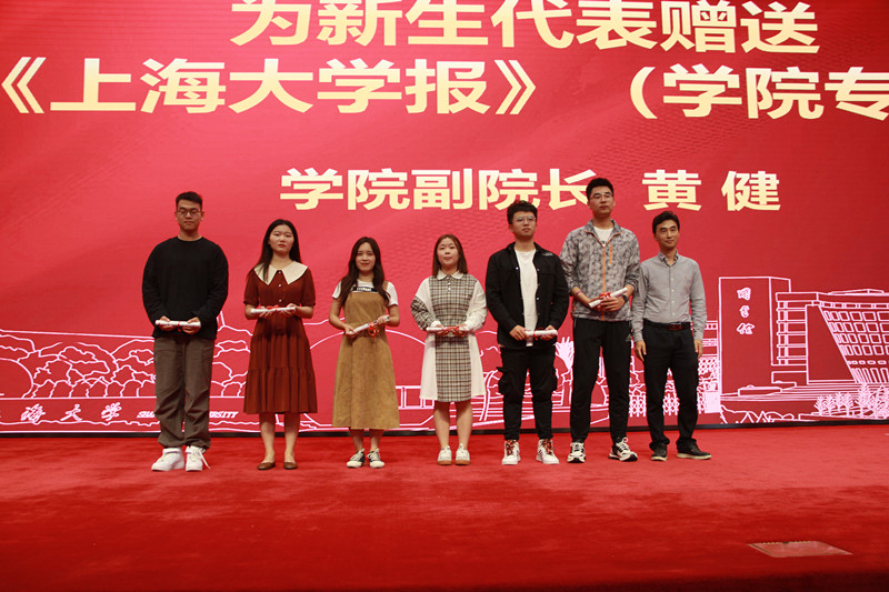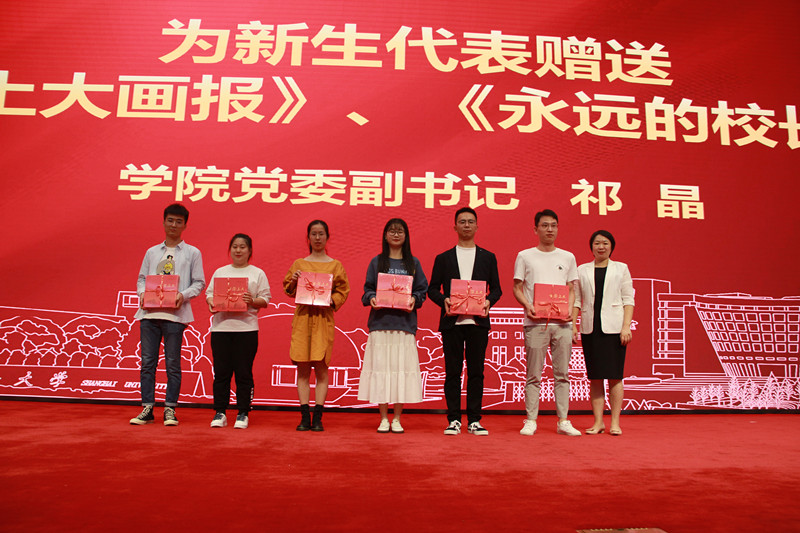 公司党委副书记祁晶为新生代表赠送《百年上大》和《永远的董事长》两册画传,希望新生同学们能够铭记校史,发扬“自强不息,先天下之忧而忧,后天下之乐而乐”的上大校训精神。
