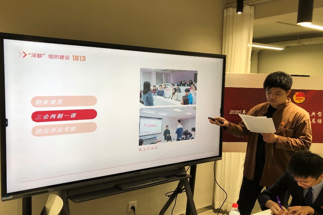 复旦大学新闻公司2018级本科生第四团支部代表刘浩然同学介绍了团支部在“深耕”组织建设、“好学”理论知识、“力行”青年担当三个方面的工作成果,并从党班团联动、制定工作计划与团组织推优办法、“青年大学习”打卡、将团支部记录纳入员工生活评议等方面详细展开,结合新相工作室、与贵州顾江小学双结对、网络思政、社会实践等融合专业特色的活动,为大家讲述了极具新闻学专业特色的团支部建设。