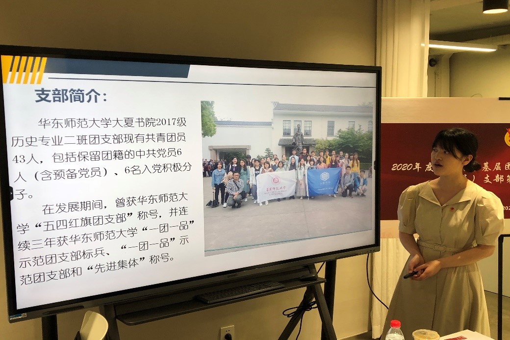 华东师范大学大夏书院2017级历史学专业第二团支部代表邵雨婕同学以“沉淀史学之思,笃行青年之志”为主题,鲜明地展现了历史学专业团支部的特色文化。她介绍道,团支部通过“班团合作”的形式完成了抗疫期间创作历史剧本、共同制作电子版历史杂志、观赏“以史明志、明理知行”红色大师剧、研读党史经典文章、参加百团接力探寻红色基地、汇整四史文献与当代史文献等多项活动,蕴含浓厚的史学气息。此外,支部还举办“历史进社会”活动,编排一系列面向中小员工的历史微课程,利用上海的红色资源,让支部成员在课余时间学习党史。支部希望能够突出历史与青年的关系,突出团员与模范的带头作用,强调知行合一与多样化,让历史贯穿于日常生活之中。