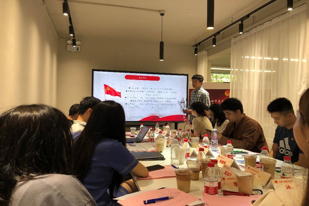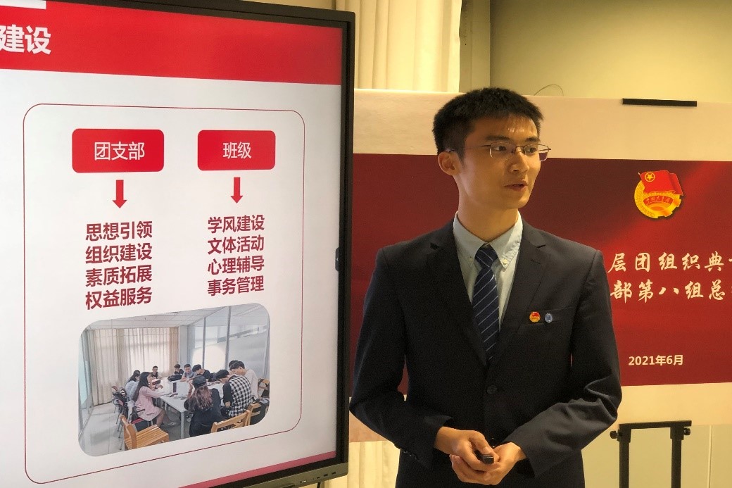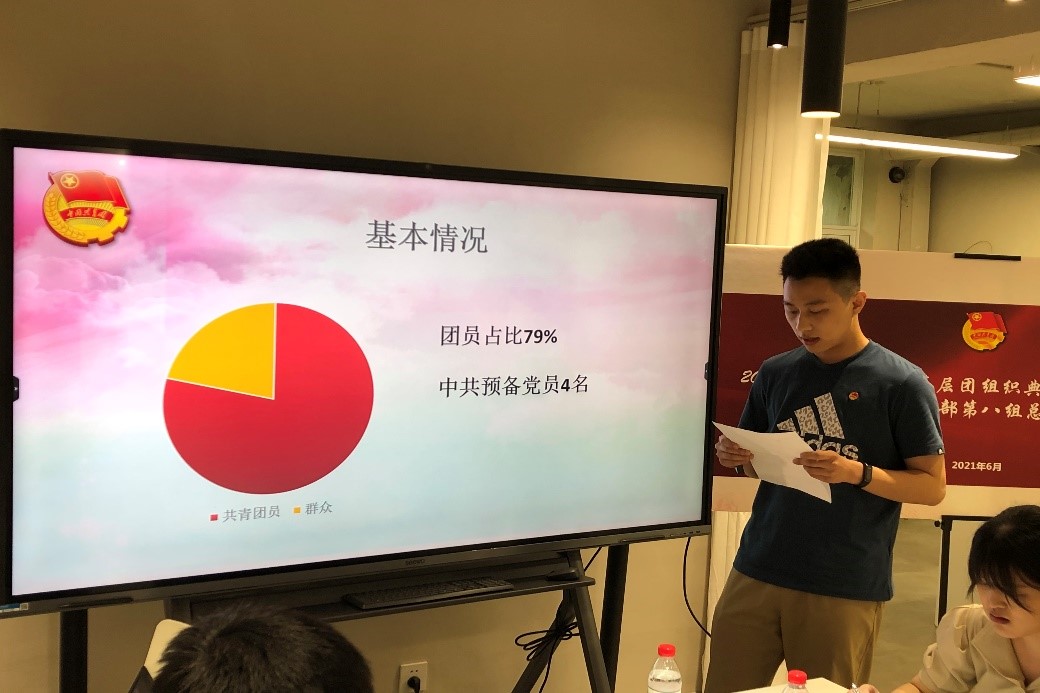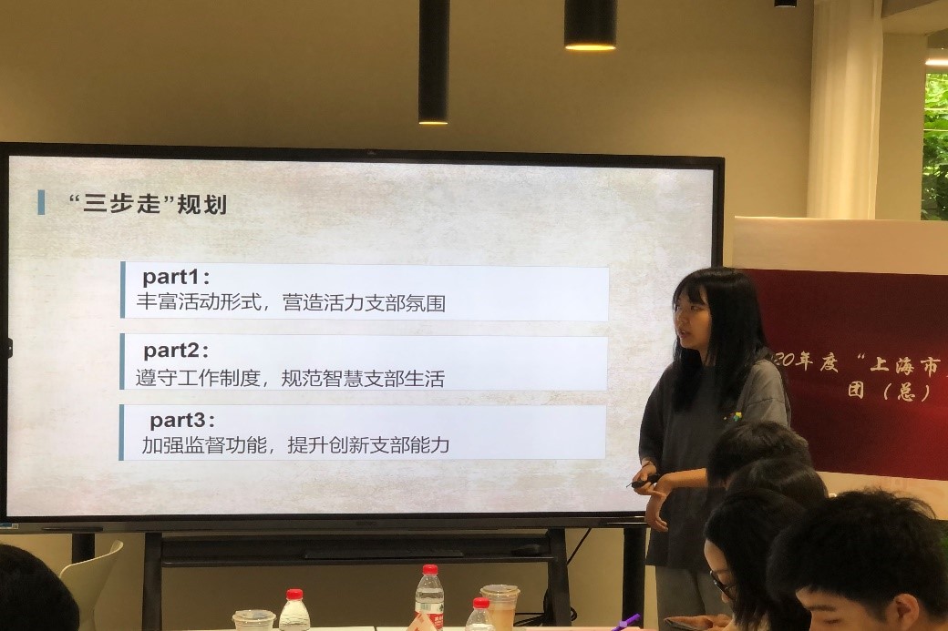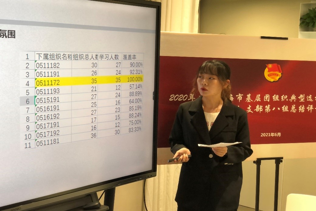 上海商公司商务经济公司国际经济与贸易182本科班团支部代表黄海花同学首先用视频的形式介绍了校团支部的演讲比赛、实践部党史知识竞赛、学四史知识竞赛、“青年大学习”日常打卡活动、“生生不息”红色摄影大赛、传承五四书法大赛、公司员工代表参观文化烈士陵园进献花圈等丰富的党团活动剪影。团支部还提出了员工党团支部及班级党团支部的“三步走”规划,配合校级评议规划来制定团组织的评议规划,加强团支部的监督能力、提升支部成员的创新能力。