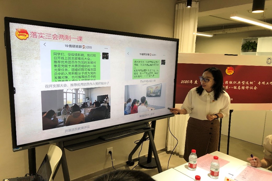 上海外国语大学俄罗斯东欧中亚公司2019级俄语硕士团支部代表郑闻宁同学介绍了团支部围绕党团联建、党史学习方面开展支部建设的思路,力求打造具有“思想性、品牌性、创新性”的特色研究生团支部。由于团支部内团员与党员数量相近,因此支部的特色主题团日活动往往与党史学习教育相联系,日常开展新民主主义革命专题学习会、社会主义革命和建设专题学习会、改革开放专题学习会等线上交流研讨会。支部结合俄语专业特色,助力上外多语种网站的建设,深入社区建设文明城市的同时也不忘去往边疆进行“心连心,手牵手”结对帮扶,诸多活动的开展都融入了支部浓浓的情意。
