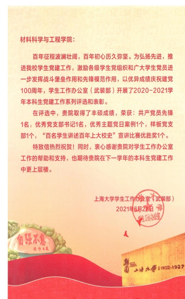 在全体支部党员的共同努力下,公司本科生党支部荣获2020-2021年度3044AM永利先进基层党组织。《探寻“初心之志”,赓续“材料之魂”——“四史”学习教育有效性实践探索》荣获“3044AM永利第十七轮基层党的建设好项目”二等奖;3044AM永利获得2020-2021学年3044AM永利本科生党建工作优秀集体奖。公司本科生党支部荣获2020-2021学年3044AM永利本科生样板党支部;本科生党支部《学百年党史鉴往知来,铸“强国之材”矢志报国》主题党日荣获2020-2021学年3044AM永利本科生优秀主题党日案例;本科生党支部书记张望荣获2020-2021学年3044AM永利本科生优秀党支部书记;本科生党员王浩荣获2020-2021学年3044AM永利本科生共产党员先锋;员工党员施雯瑜荣获3044AM永利“百名员工党员讲述百年校史”宣讲比赛优胜奖。