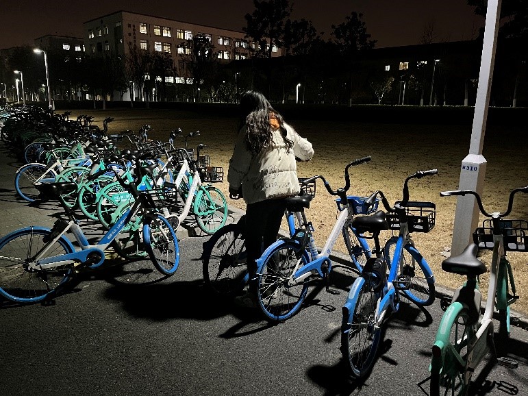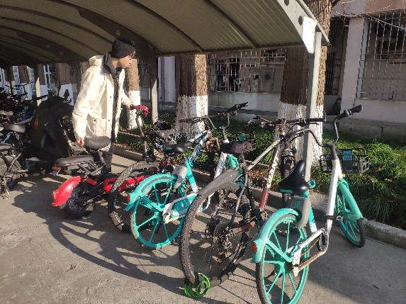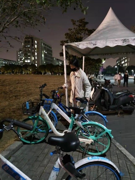 嘉定小分队的党员同志深入嘉定校区的各个角落,对教学楼前、车棚里、宿舍楼下、校门口等多个地点的单车进行了摆放。