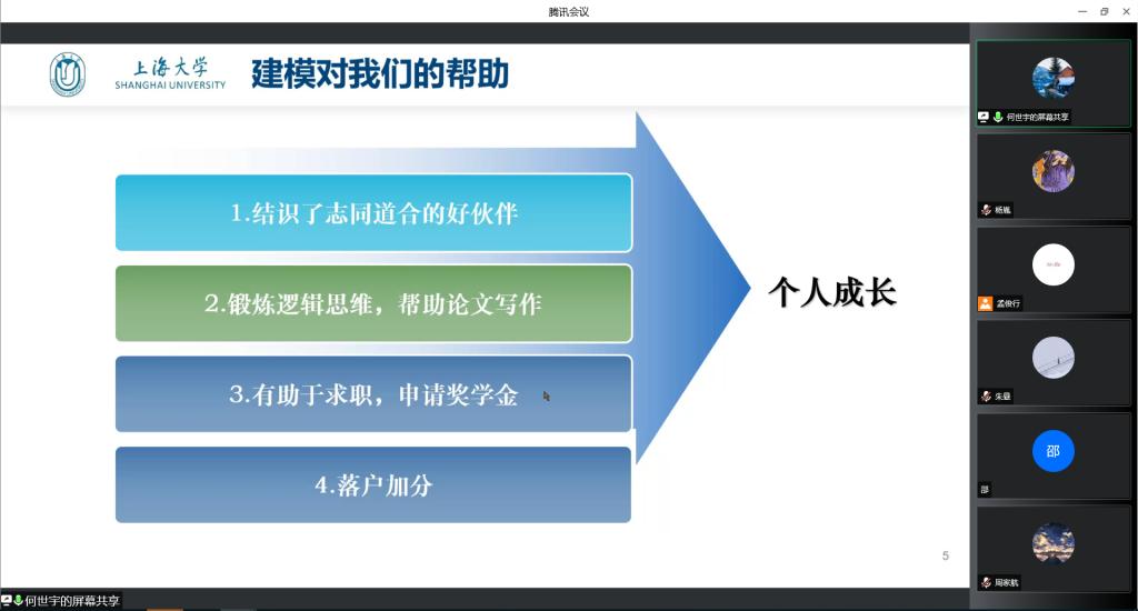 往届参赛选手何世宇对其参加研究生数学建模大赛的经验进行分享,从参赛流程、个人经验和收获等方面展开交流。何世宇指出,比赛过程对我们的个人成长有很大的帮助,希望大家能够积极投身于赛事之中去锻炼自己。接着沈璐宇同学就自己“挑战杯”的参赛经历、参观交流等方面和同学们进行分享,并表示只有亲自去经历这些赛事,才能体会到科创竞赛的魅力。